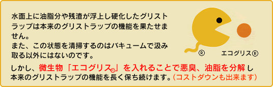 エコグリスがグリストラツフ内の油脂等の除去を助けます。